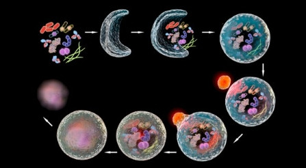 自噬肇始于一种被称为终止膜(phagophore)的膜结构,该结构开头于内质网(ER)/反式高尔基体以及内体所孝敬的脂质双层膜 。跟着终止膜渐渐膨大,包裹细胞内的货品,如卵白质伙同物、细胞器和核糖体,从而将这些胞内因素封装在一个双层膜结构中,造成自噬体(autophagosome)。熟习的自噬体随后与溶酶体和会,造成自噬溶酶体,其中的本色物被溶酶体酸性卵白酶降解。降解后的居品,如氨基酸和其他副居品,经由溶酶体的渗入酶和转运卵白被运载回胞质中,可用于合成大分子或参与代谢流程 。