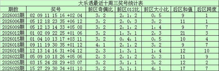 前区奇偶走势:上期前区奇偶比为1:4,上周三前区奇偶比3:2,最近十周三奇数号码弘扬占优,本期正式偶数号码回补转热,疏浚奇偶比2:3。